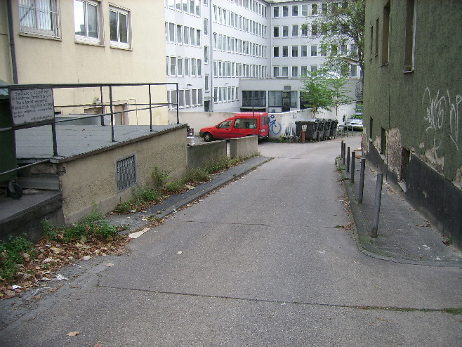Hier vom Hof an der Rückfrontdes Hauses raste die schwarze Limousine heraus.